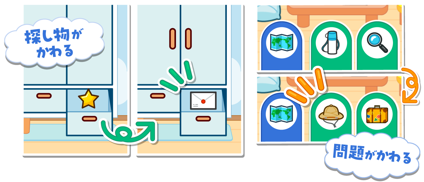 一部の探すアイテムは、遊ぶたびに種類や場所が変わるので、繰り返し遊んでも飽きずに楽しめるよ。